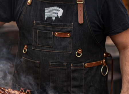 Close-up of a man wearing a denim BBQ apron with multiple pockets in front of a graffiti wall.